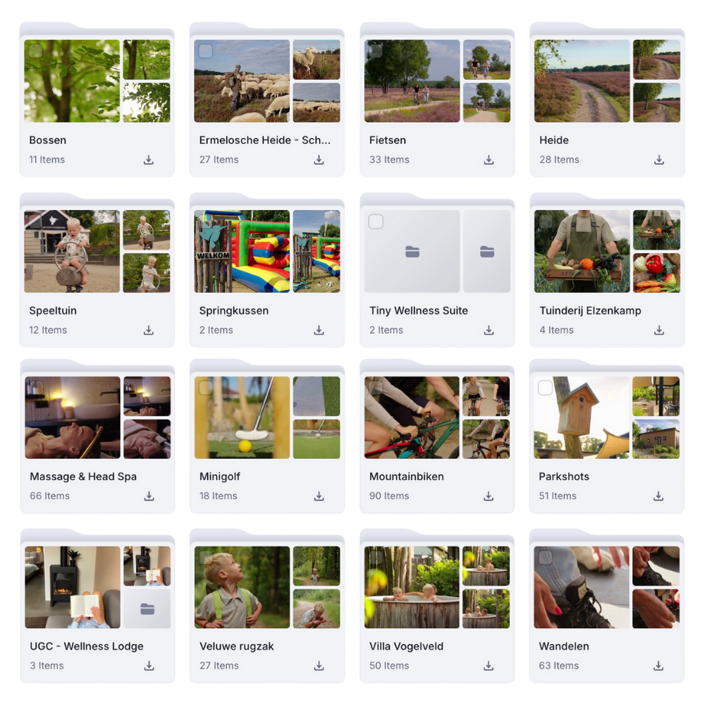 Wij houden de gepersonaliseerde media library van je vakantiepark continu up-to-date. Verouderde beelden worden gearchiveerd, nieuwe content wordt toegevoegd en bestaande beelden worden verrijkt met slimme AI-technieken. Zo beschik je altijd én overal over een actuele en direct inzetbare beeldenbank voor je website, socials en campagnes.